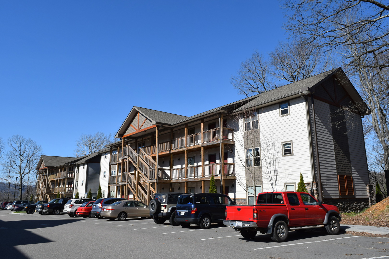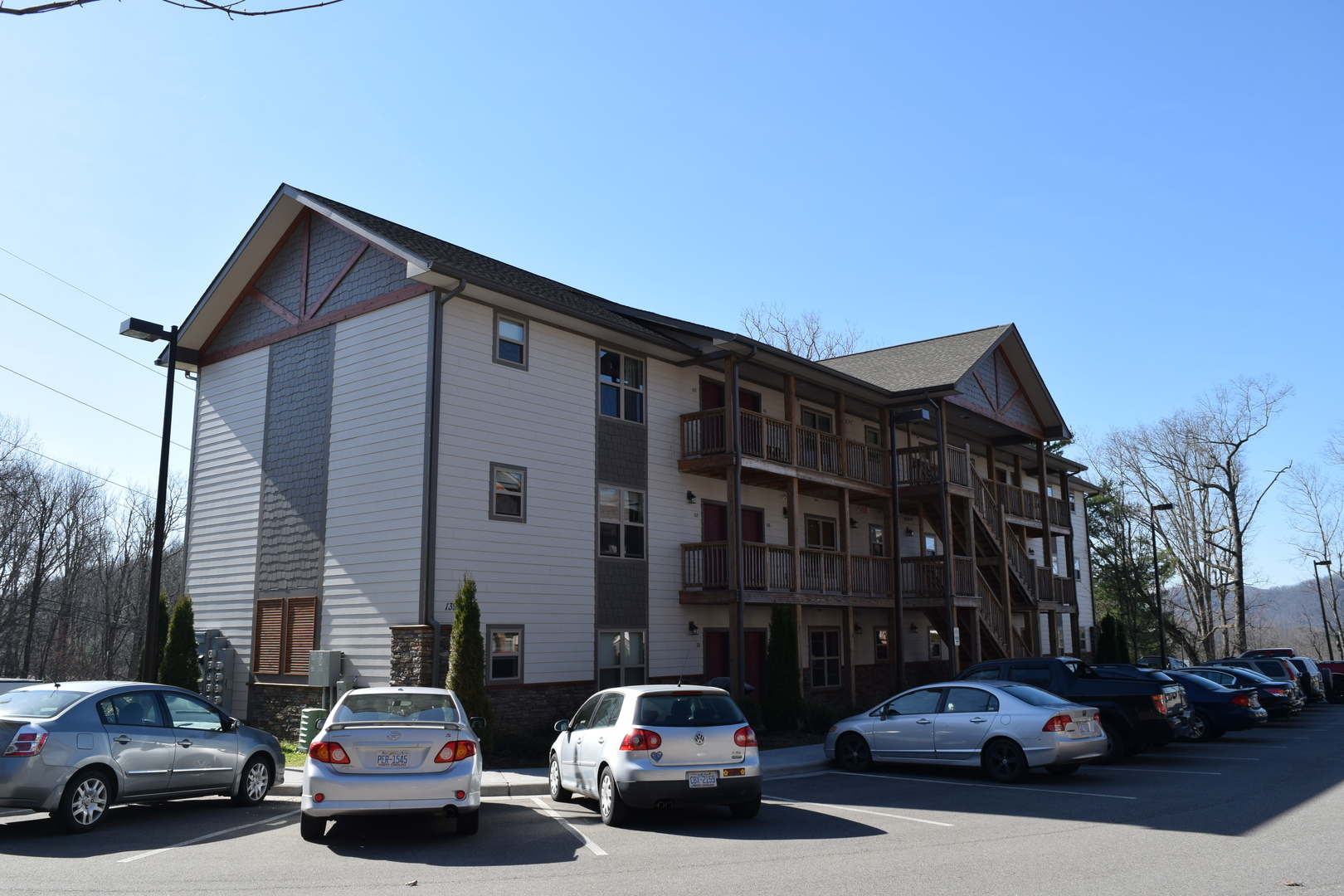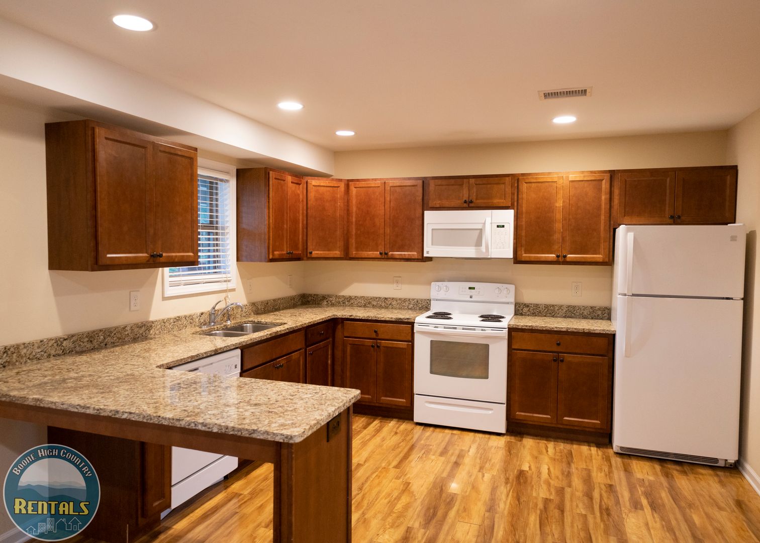 Upscale living awaits you at Highland Woods I, 2bd/2ba units. Inside find regal dark cabinets, granite, and full size appliances in the spacious kitchen featuring a counter for bar seating. The open living room provides a ceiling fan, recessed lighting, and plenty of natural light. Throughout the entire unit, find luxury vinyl plank flooring, beige paint, and ceiling fans. Each room offers a spacious walk in closet and en suite bath. Recent exterior upgrades include steps leading to the grassy common area, featuring hammock poles, a picnic area, and clear path to a sheltered AppalCART stop. Located just minutes from campus and downtown Boone.