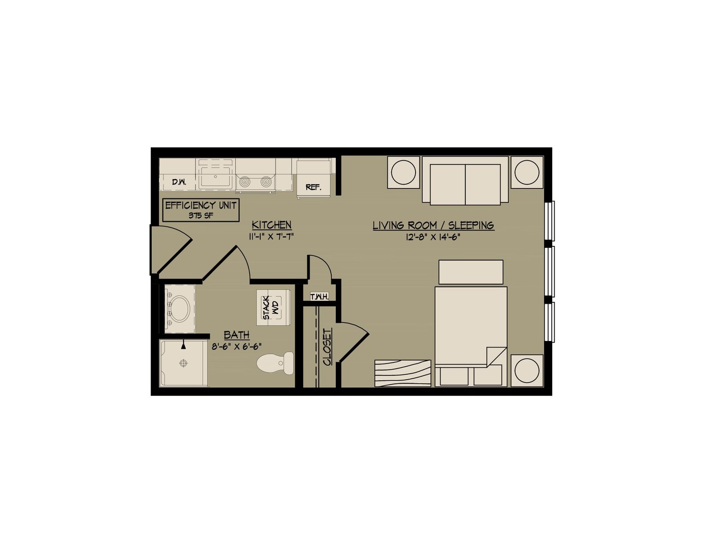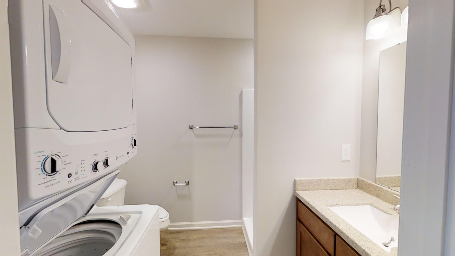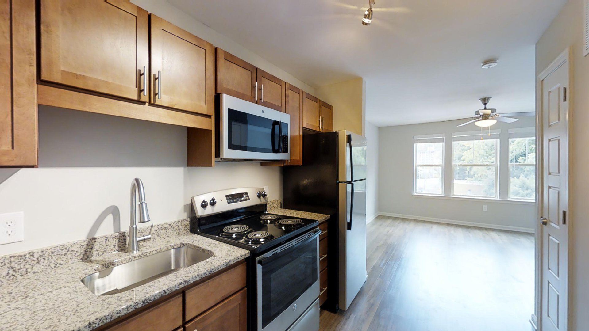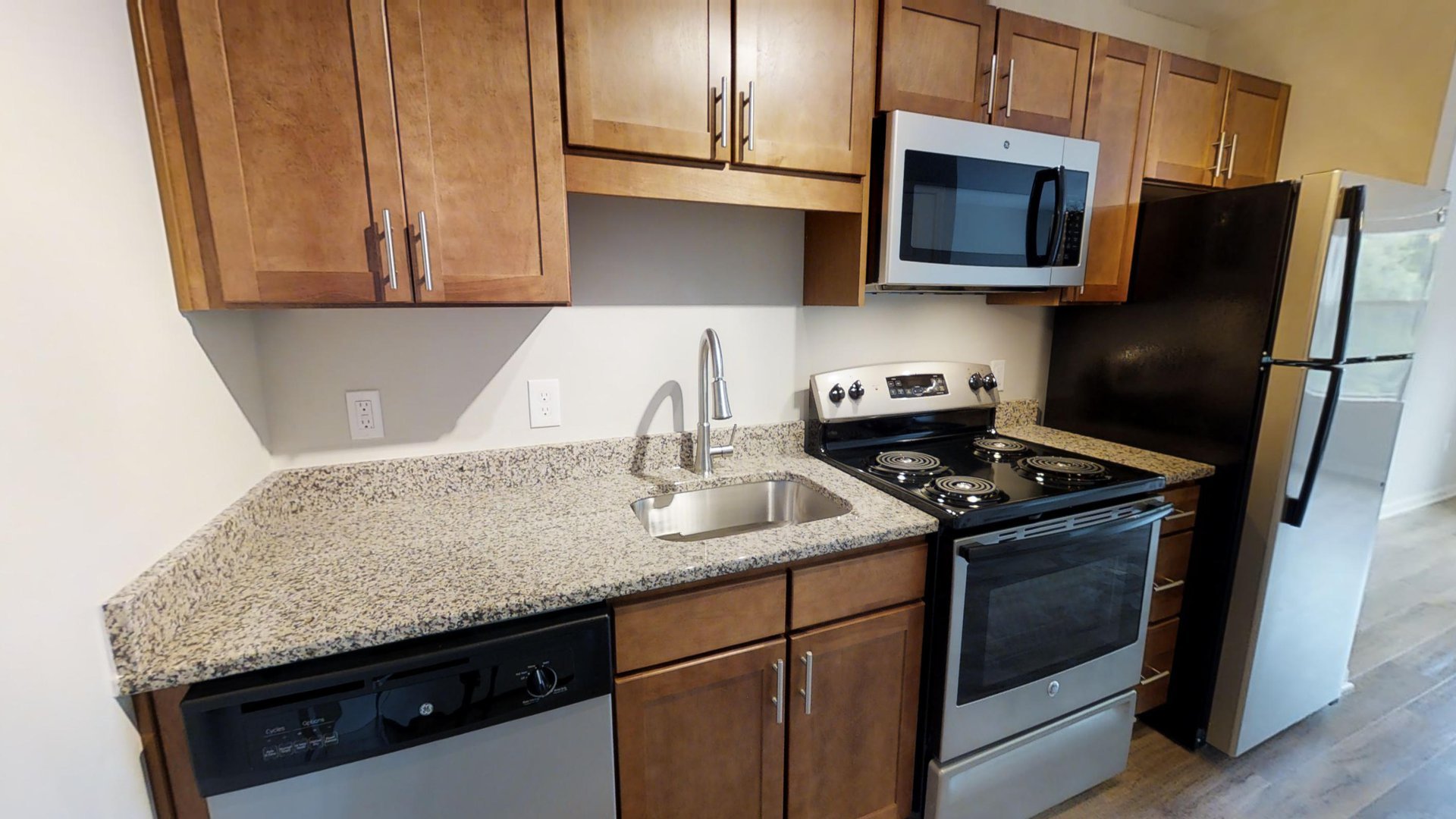 All units have granite counters, luxury vinyl flooring, stainless steel appliances, washer and dryer, and a ceiling fan in the living/bedroom.