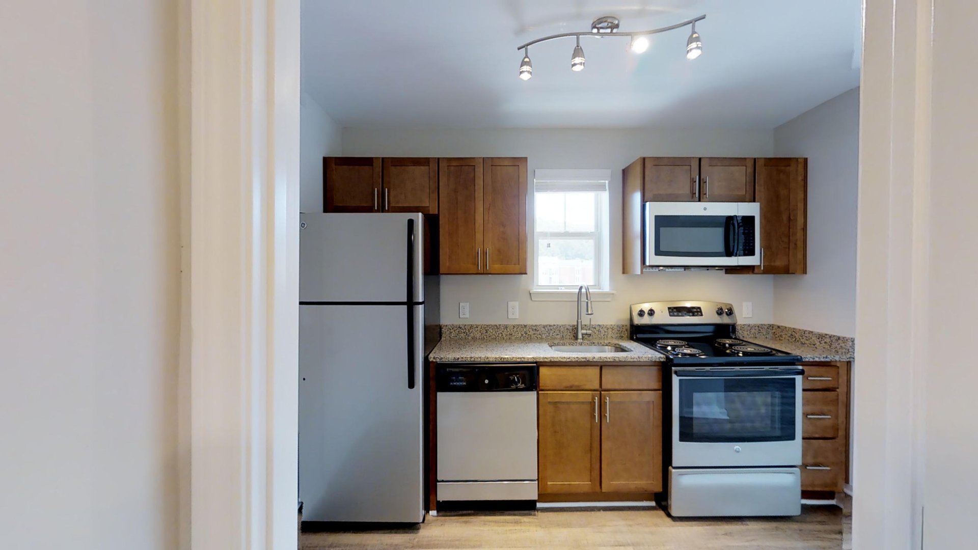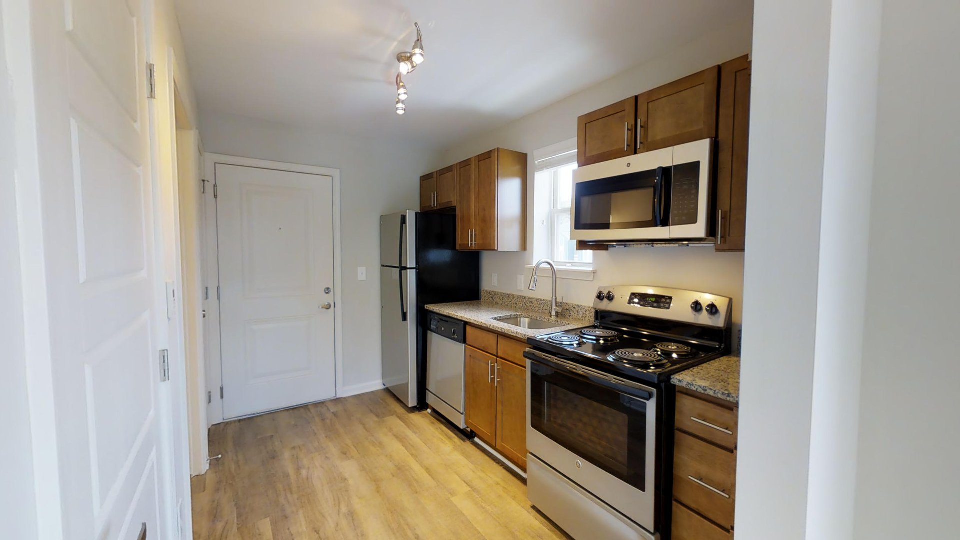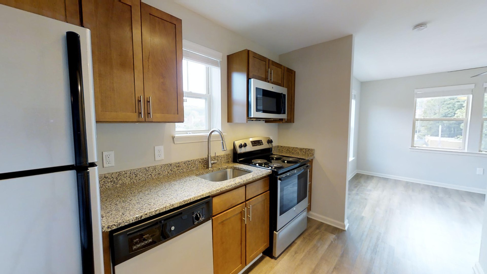 All units have granite counters, luxury vinyl flooring, stainless steel appliances, washer and dryer, and a ceiling fan in the living/bedroom.