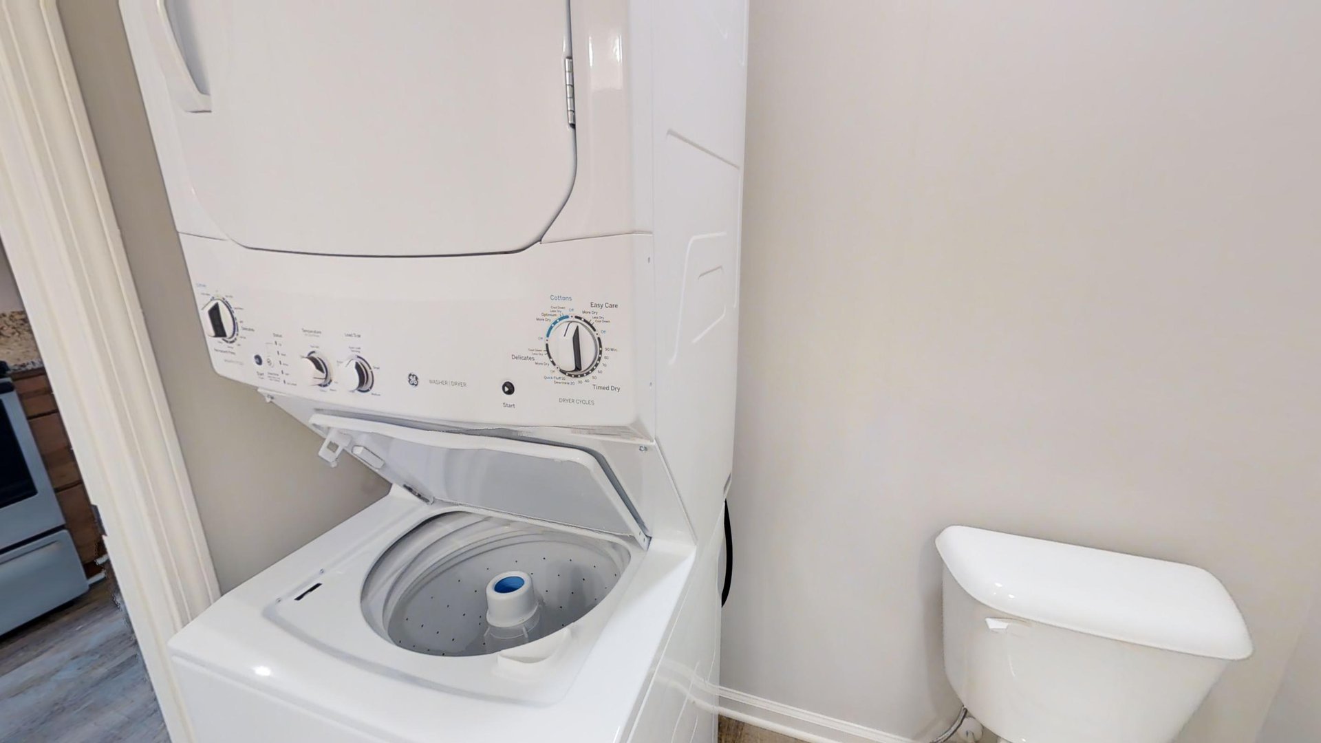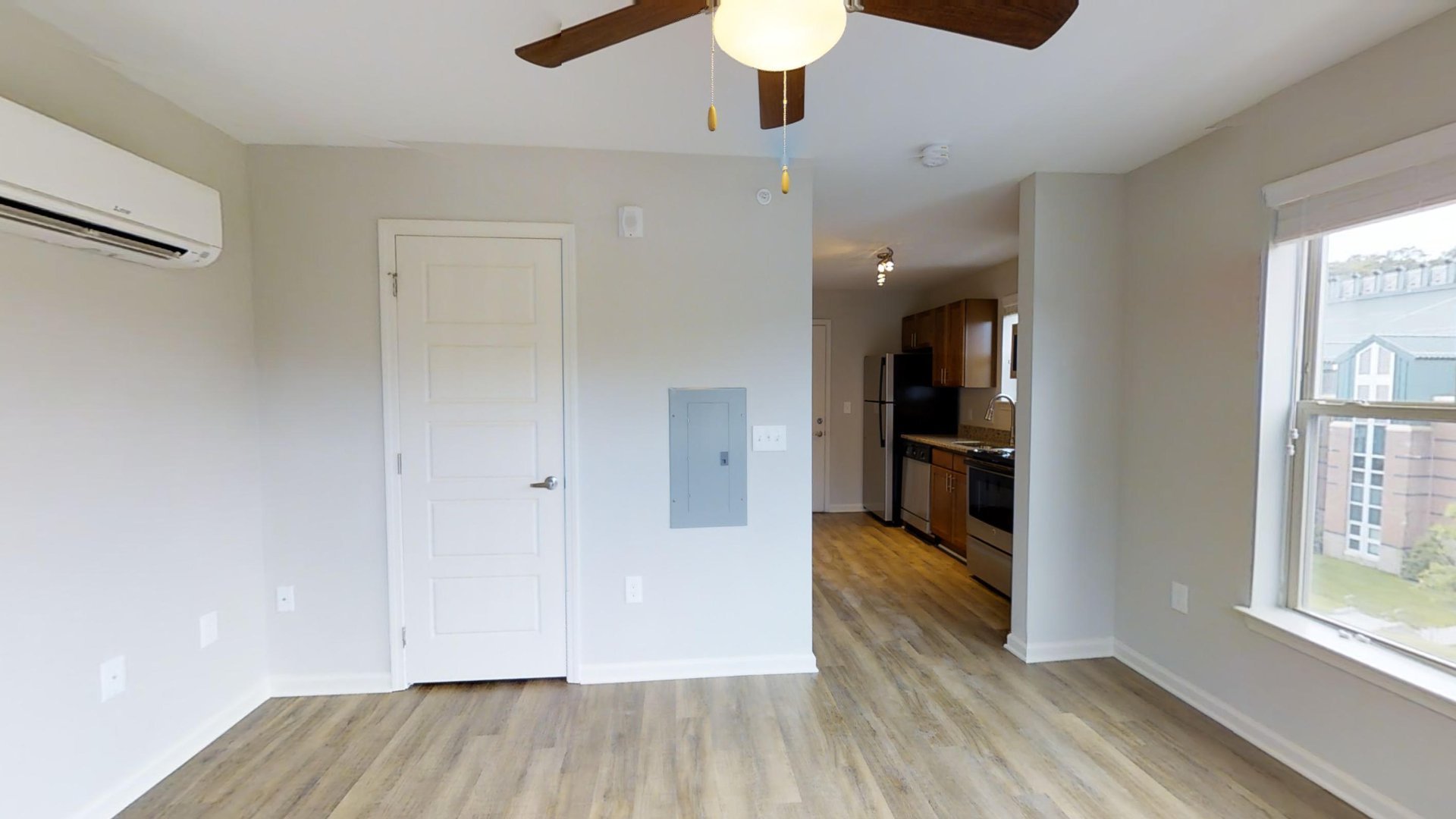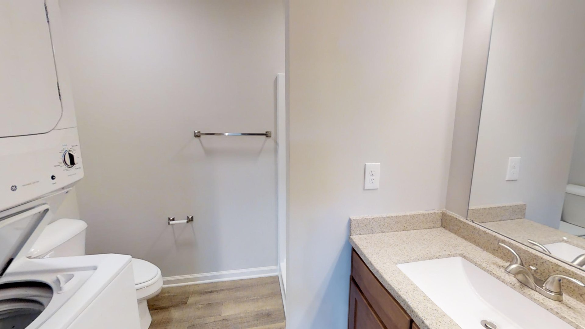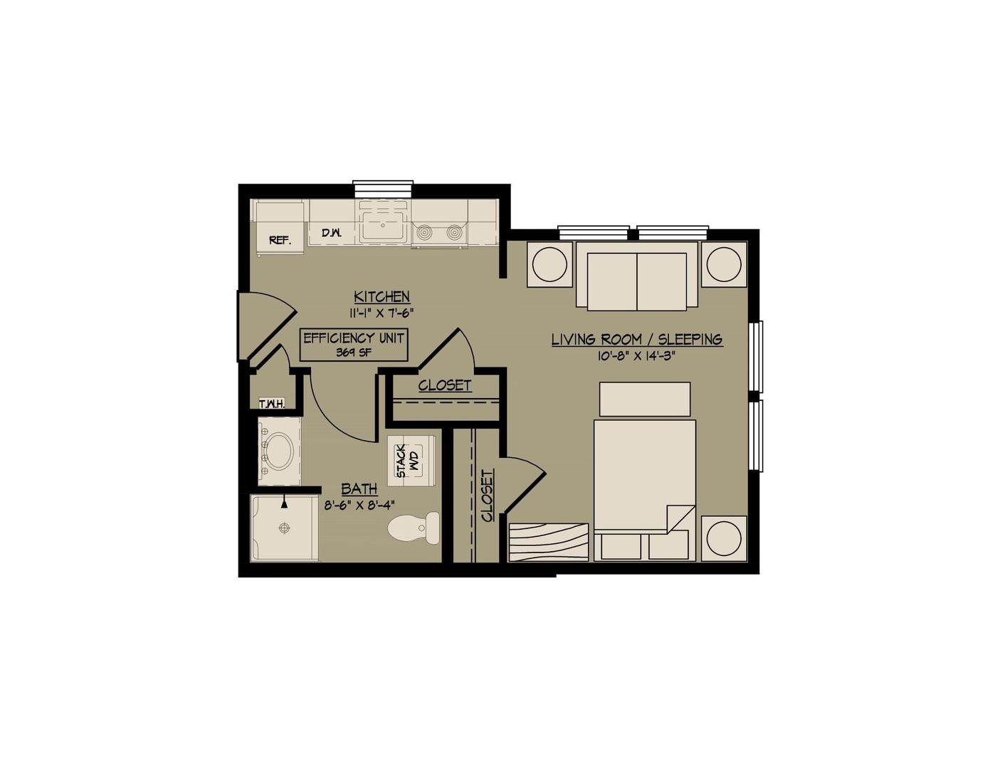 All units have granite counters, luxury vinyl flooring, stainless steel appliances, washer and dryer, and a ceiling fan in the living/bedroom.