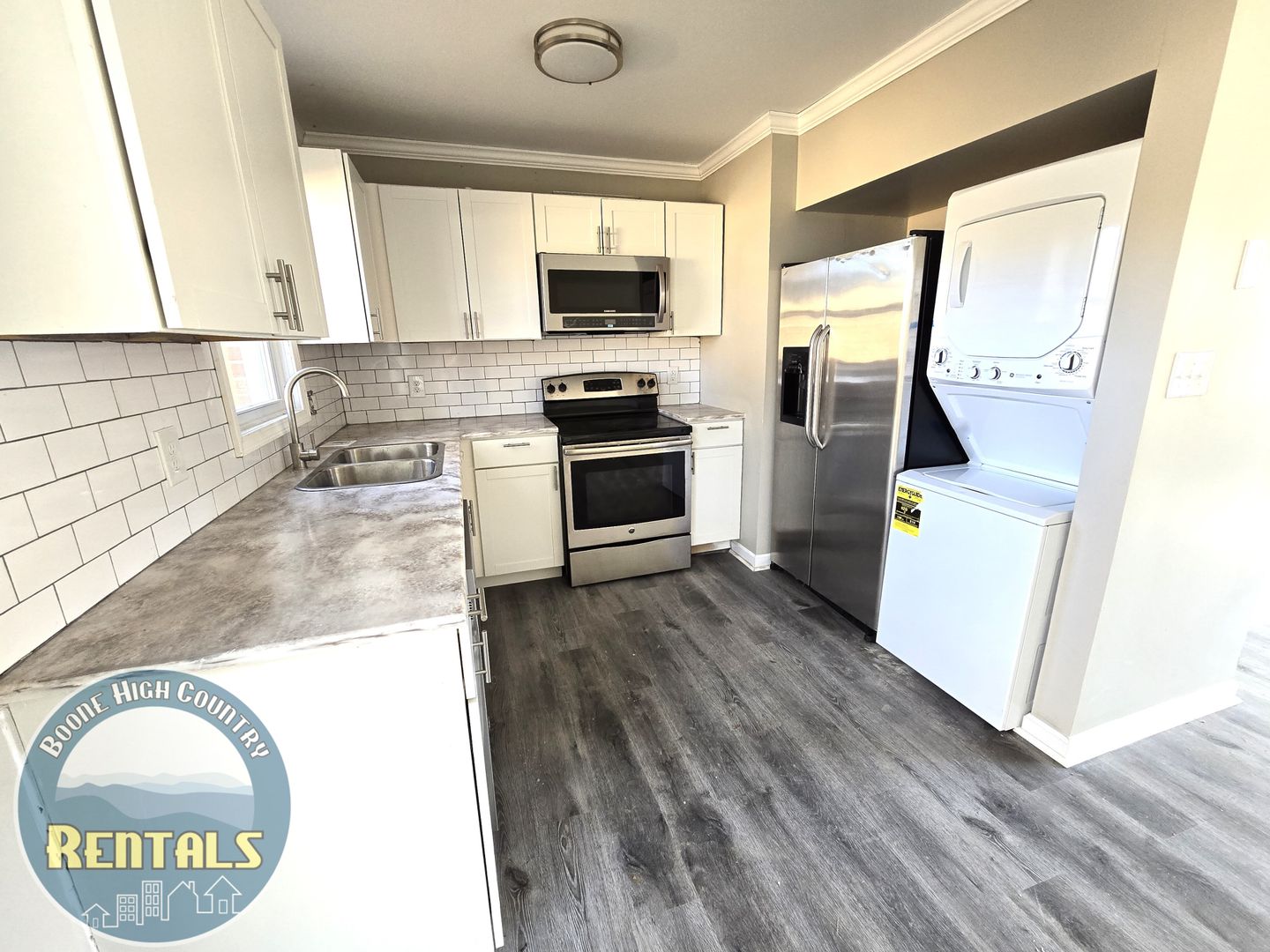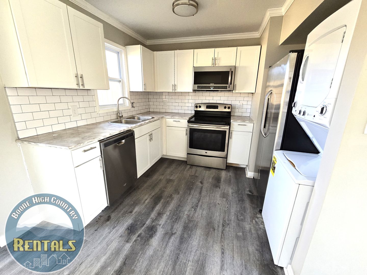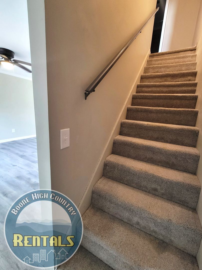 Welcome to our newly renovated 2-bedroom apartment in the beautiful location of Boone, NC. Experience the best of Boone living in this newly renovated apartment with all the amenities you need for a comfortable lifestyle. Located just off old 421, you'll have convenient access to Boone. You'll find an open floor plan with lots of natural light through the front door. This apartment offers a modern and stylish living space, perfect for those seeking comfort and convenience. The kitchen is equipped with stainless steel appliances, adding a touch of elegance to your cooking experience. Each unit has its own sliding glass door to a patio and quaint fenced-in yard. Upstairs, you'll find both bedrooms with a shared bath. The primary bedroom features his and her closets along with an additional closet for storage. Across the hall is a second bedroom with a large closet. The bathroom features a tub/shower combination with subway tile.