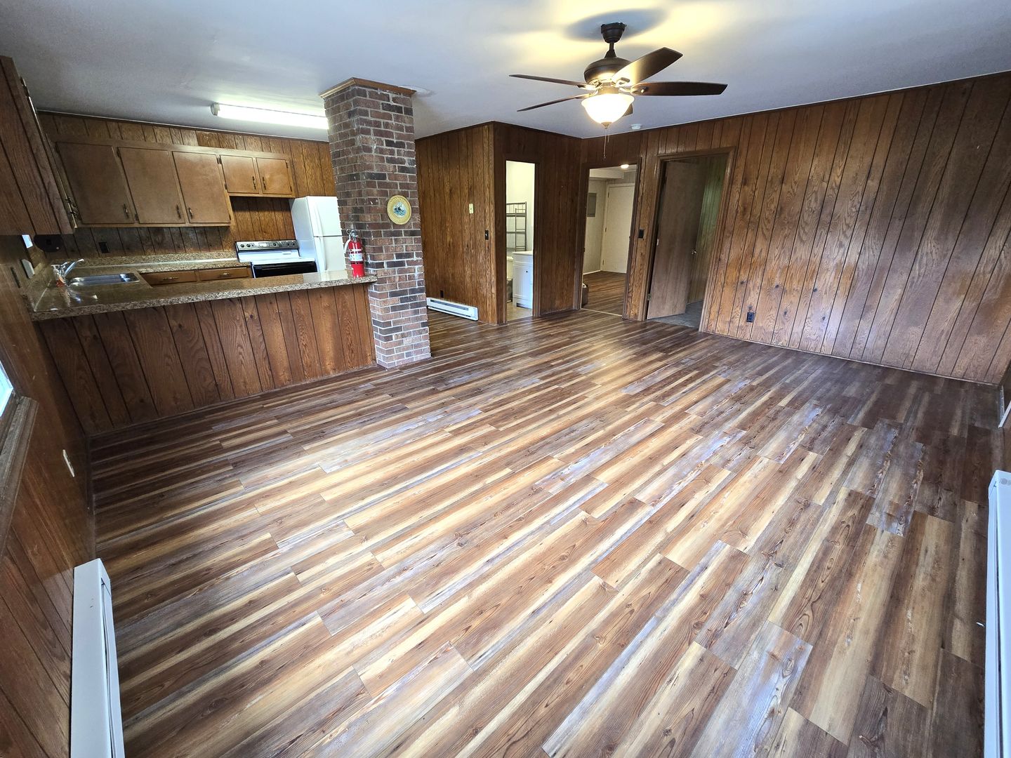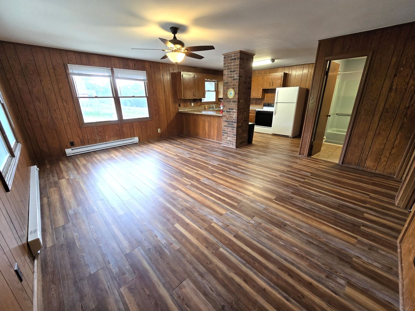 Surrounded by a cow pasture, this quaint country farmhouse has been divided into 5 units. Unit #2 opens into a spacious open floor plan. The space allows for a sizable living and dining area and bar seating. The kitchen offers plenty of cabinet storage! Ceiling fans have been installed for added airflow.