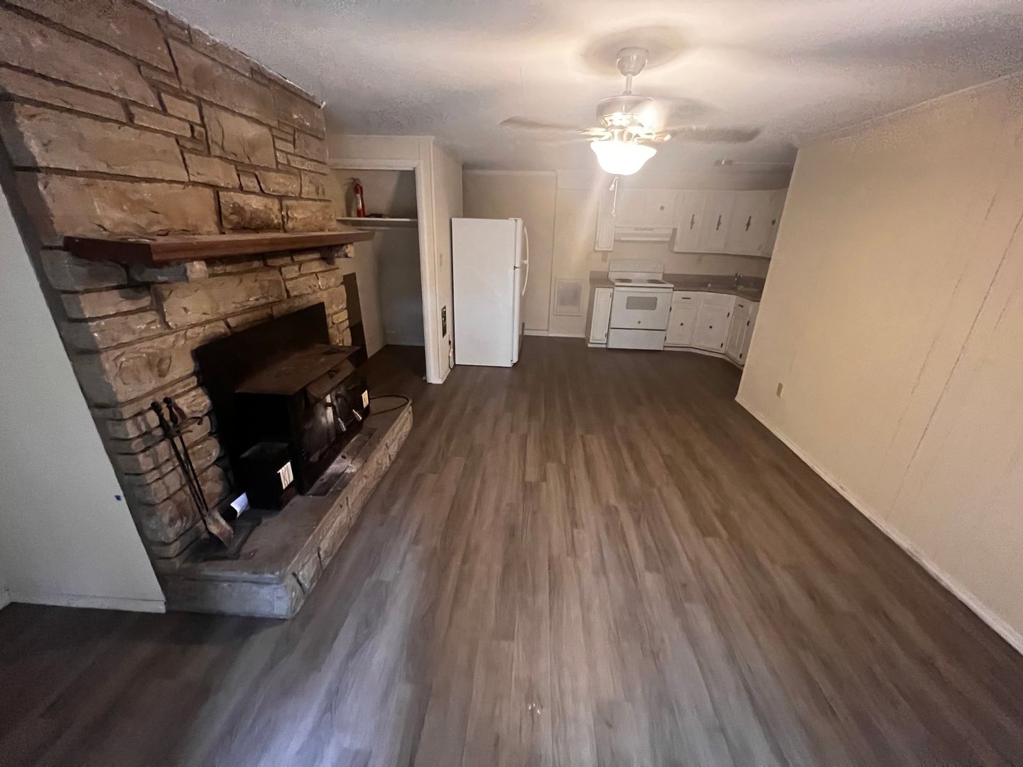 Inside find an open concept living and kitchen area with a lovely stone fireplace. Each bedroom is spacious, with a ceiling fan and lots of natural light. The shared bathroom features plenty of storage, and there is a full size washer and dryer located in the unit.