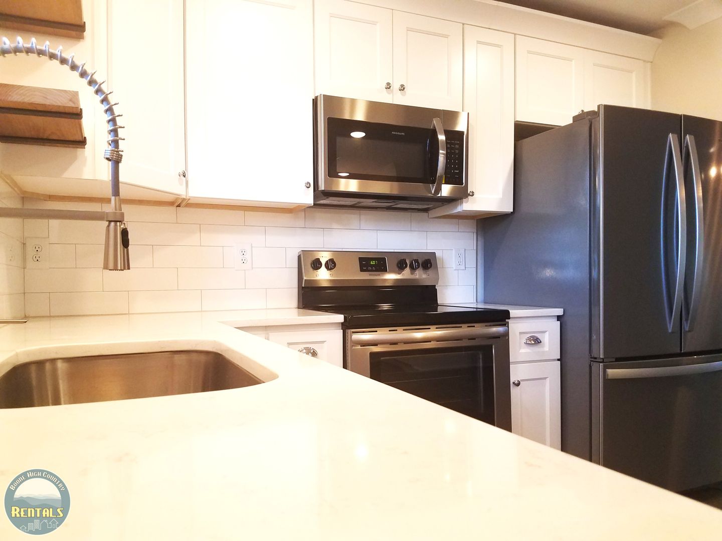 231 Stratford is the 2nd home on the left at the entrance to the community with a front covered deck and 2 parking spaces. Walk inside the front door to the spacious open floor concept. The living area features white wainscoting, crown molding, and a stone fireplace as the centerpiece. The kitchen boasts stainless steel appliances, subway tile backsplash, beautiful white countertops, large basin sinks, and a sizable pantry. Enjoy seeing the beautiful mountain views from your kitchen window. The back door leads to your 2nd spacious open deck with a shaded view of the mountains. The downstairs also includes a coat closet, laundry closet, and half bath.
