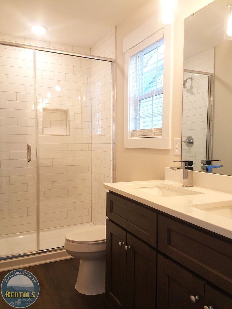 Head upstairs to the sleeping quarters. The primary bedroom is spacious with a sizable closet. The attached bath features double vanity sinks and a tiled walk-in shower. There are 2 other bedrooms on this level, both with closets, and the 2nd full bath with a tub shower combination featuring the same beautiful subway tile.