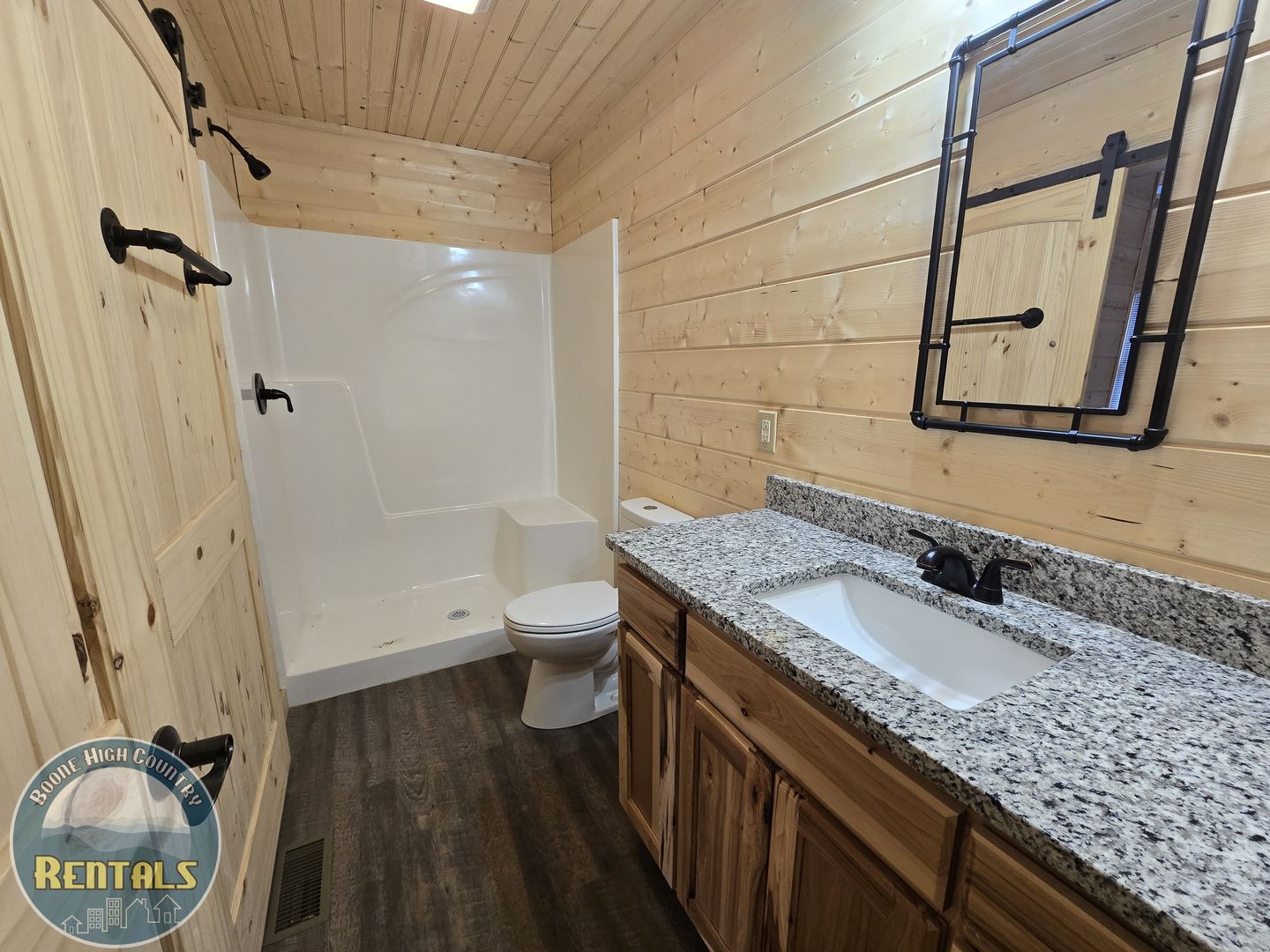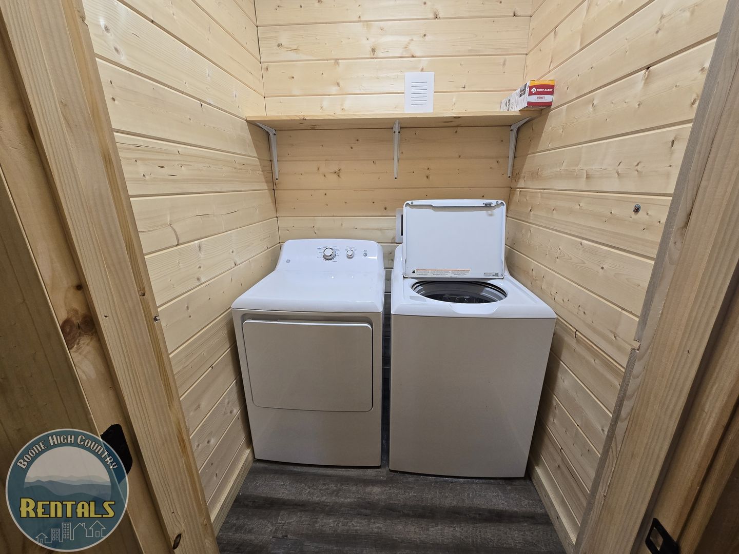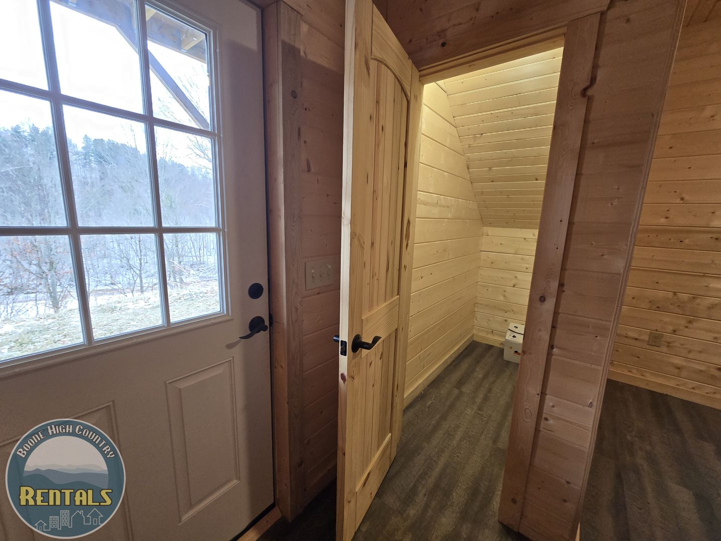 A keyless front door entry leads into an open-concept living room and kitchen, The cabin has luxury vinyl plank flooring throughout, high-vaulted ceilings, and ample natural light. The kitchen features plenty of cabinet space with granite countertops and includes all full size appliances. To the left is the 1st bedroom with the same high ceilings, a fan, and ample storage space. The first floor bathroom with a walk-in shower can be accessed via a sliding barn door from the bedroom or from the living space. Off the living area is your spacious covered back porch, perfect for relaxing with your morning coffee.