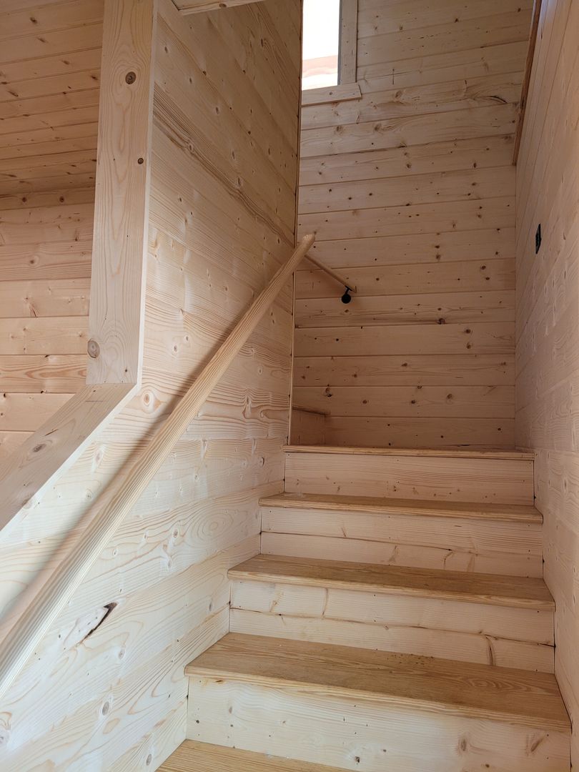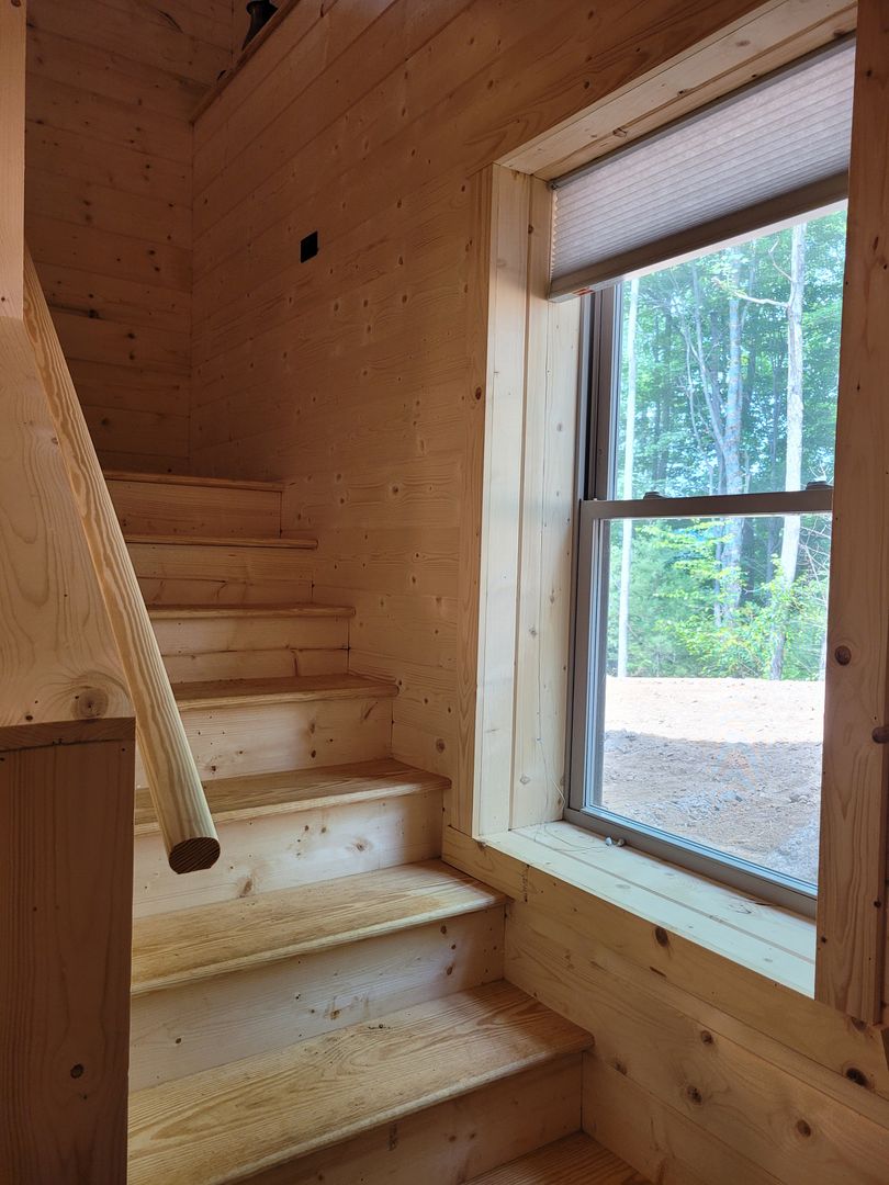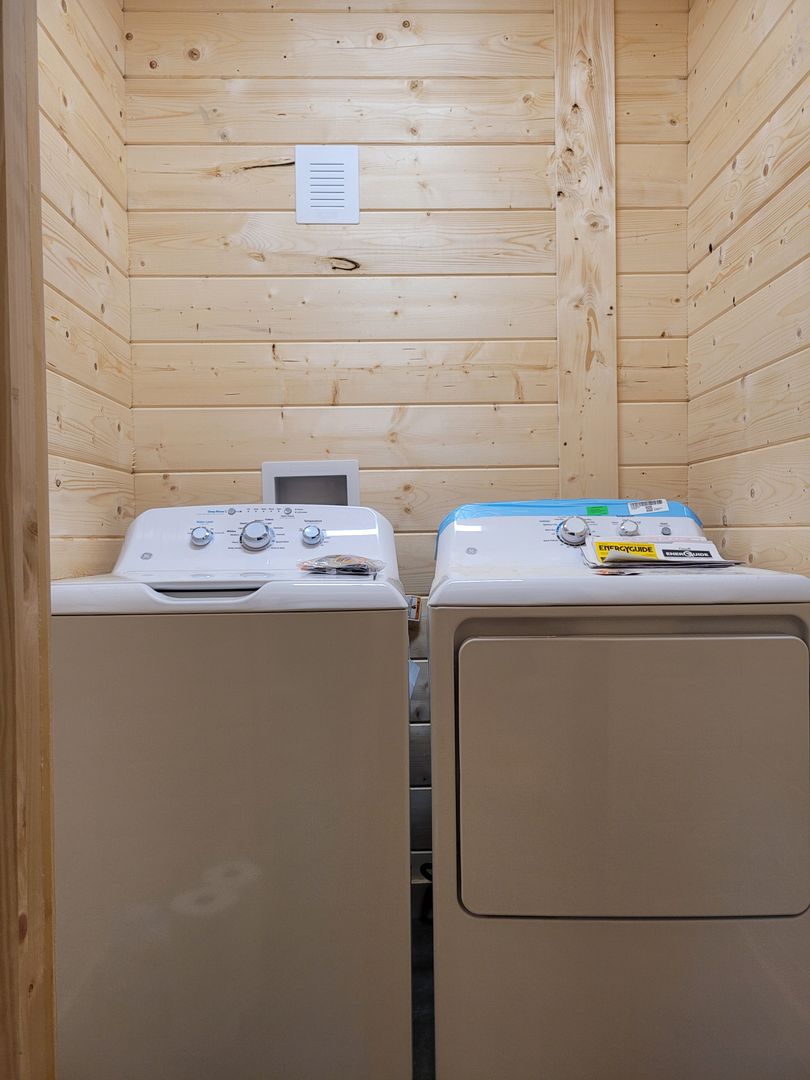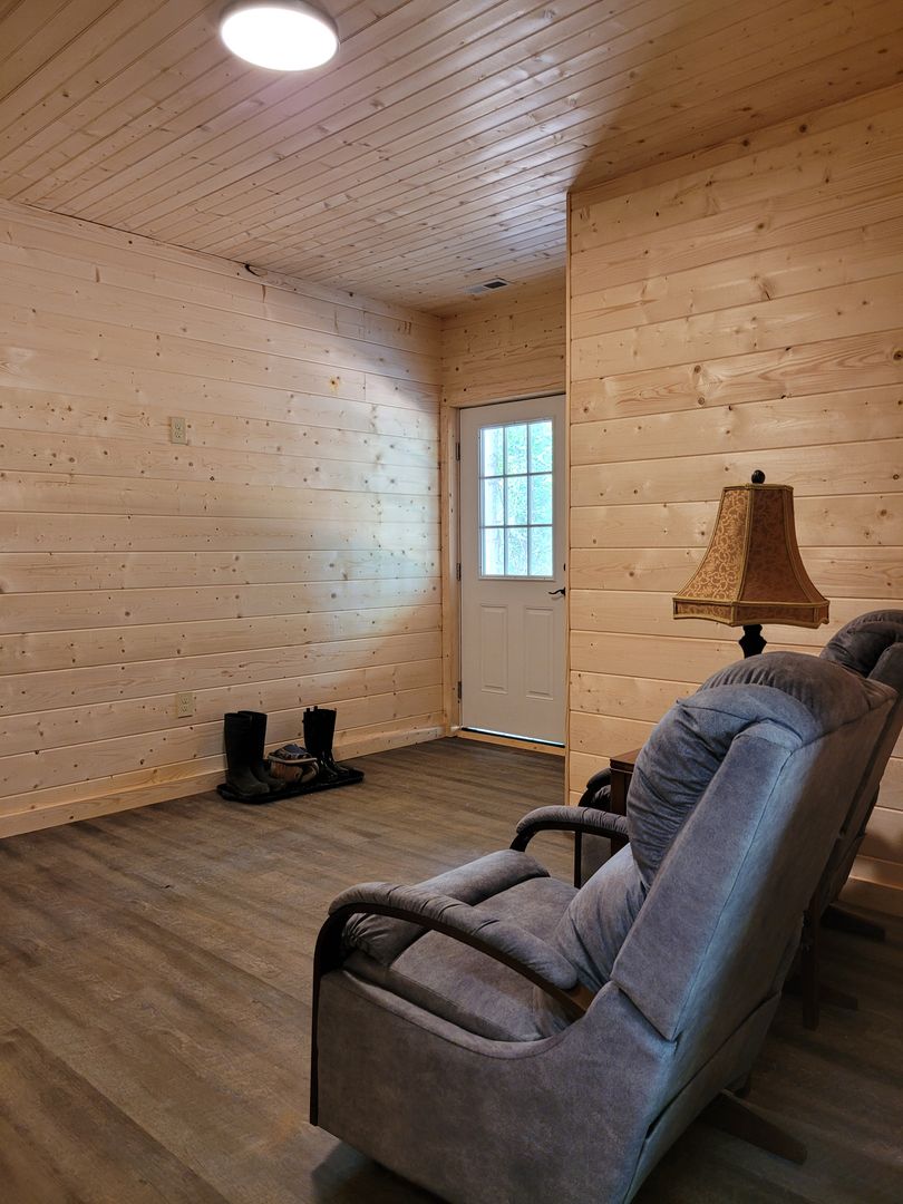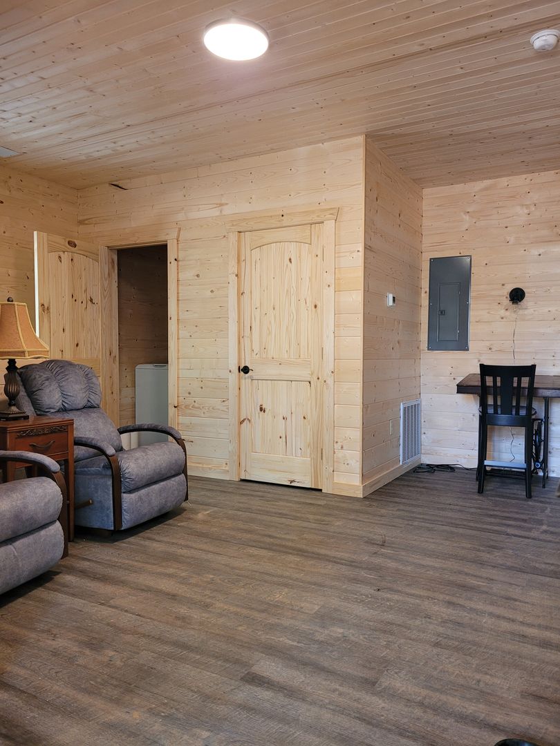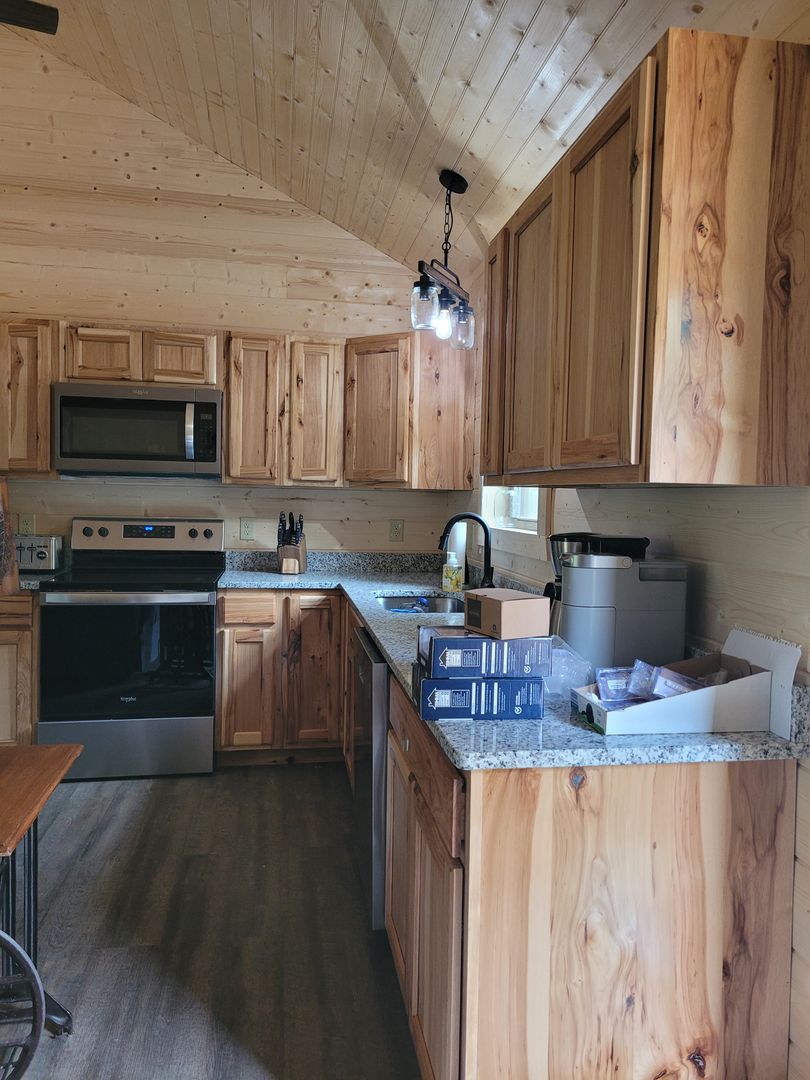 A keyless front door entry leads into an open-concept living room and kitchen, The cabin has luxury vinyl plank flooring throughout, high-vaulted ceilings, and ample natural light. The kitchen features plenty of cabinet space with granite countertops and includes all full size appliances. To the left is the 1st bedroom with the same high ceilings, a fan, and ample storage space. The first floor bathroom with a walk-in shower can be accessed via a sliding barn door from the bedroom or from the living space. Off the living area is your spacious covered back porch, perfect for relaxing with your morning coffee.