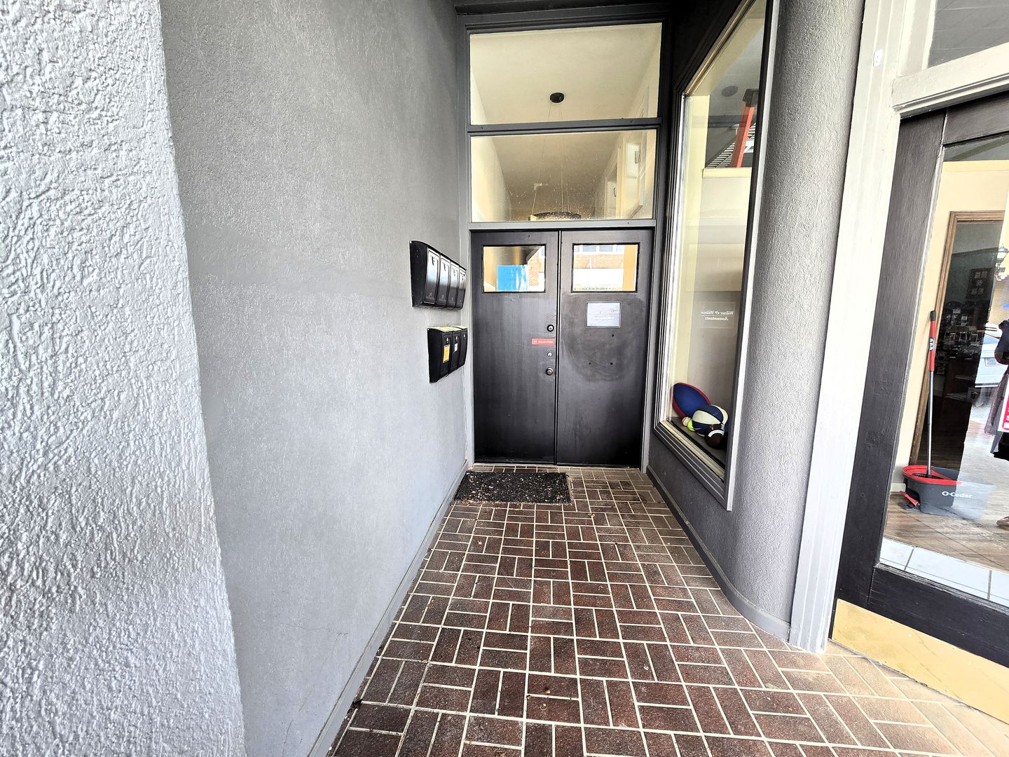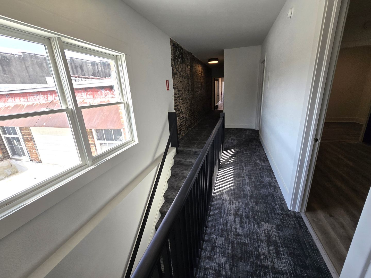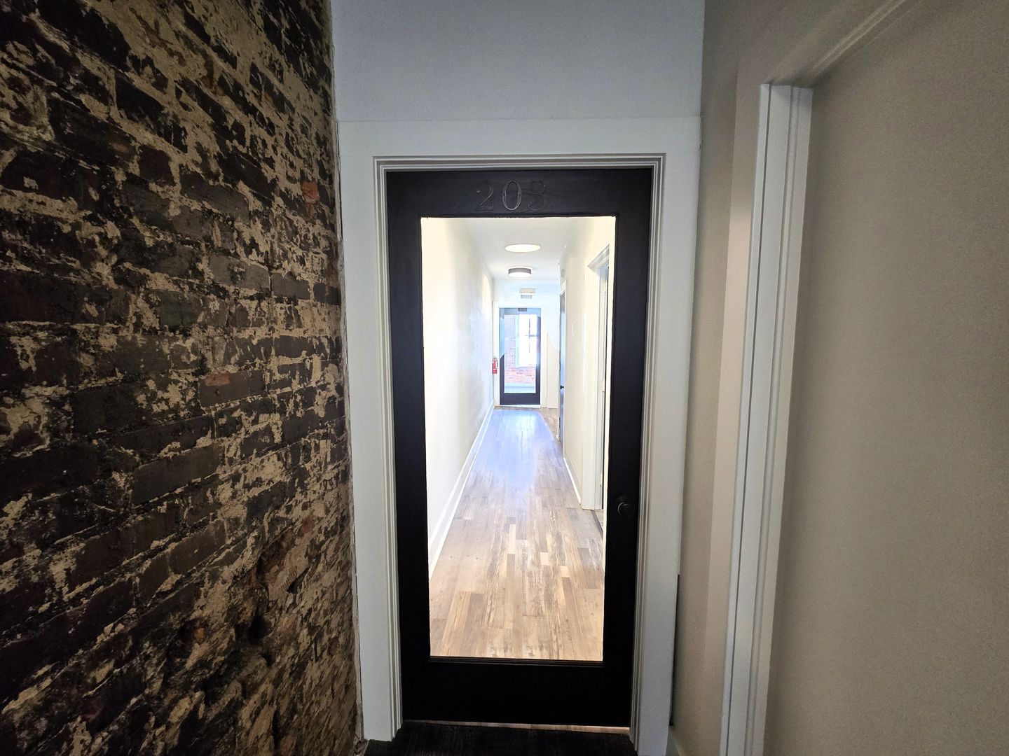 The space has been thoughtfully updated with new flooring, fresh paint, and modern lighting throughout, creating a clean and professional atmosphere. Please note this is a walk-up unit—access is via a set of carpeted stairs from the main hallway (no elevator). A shared restroom is conveniently located just around the corner from the unit.