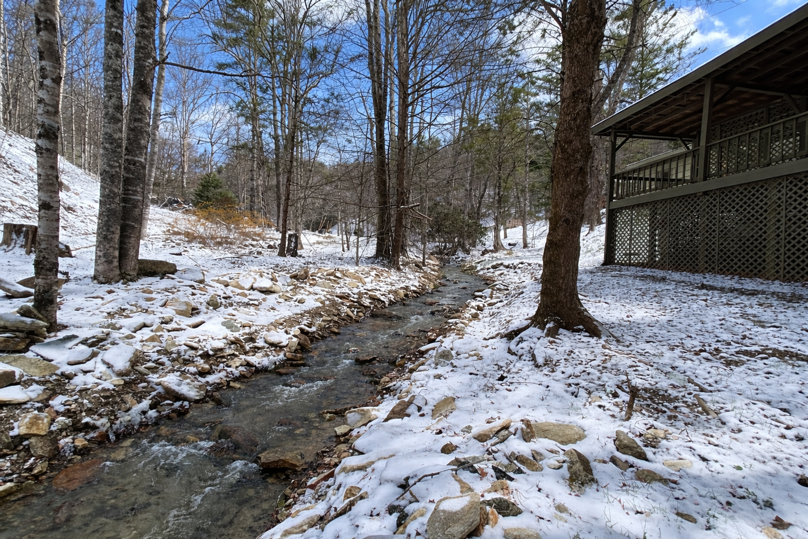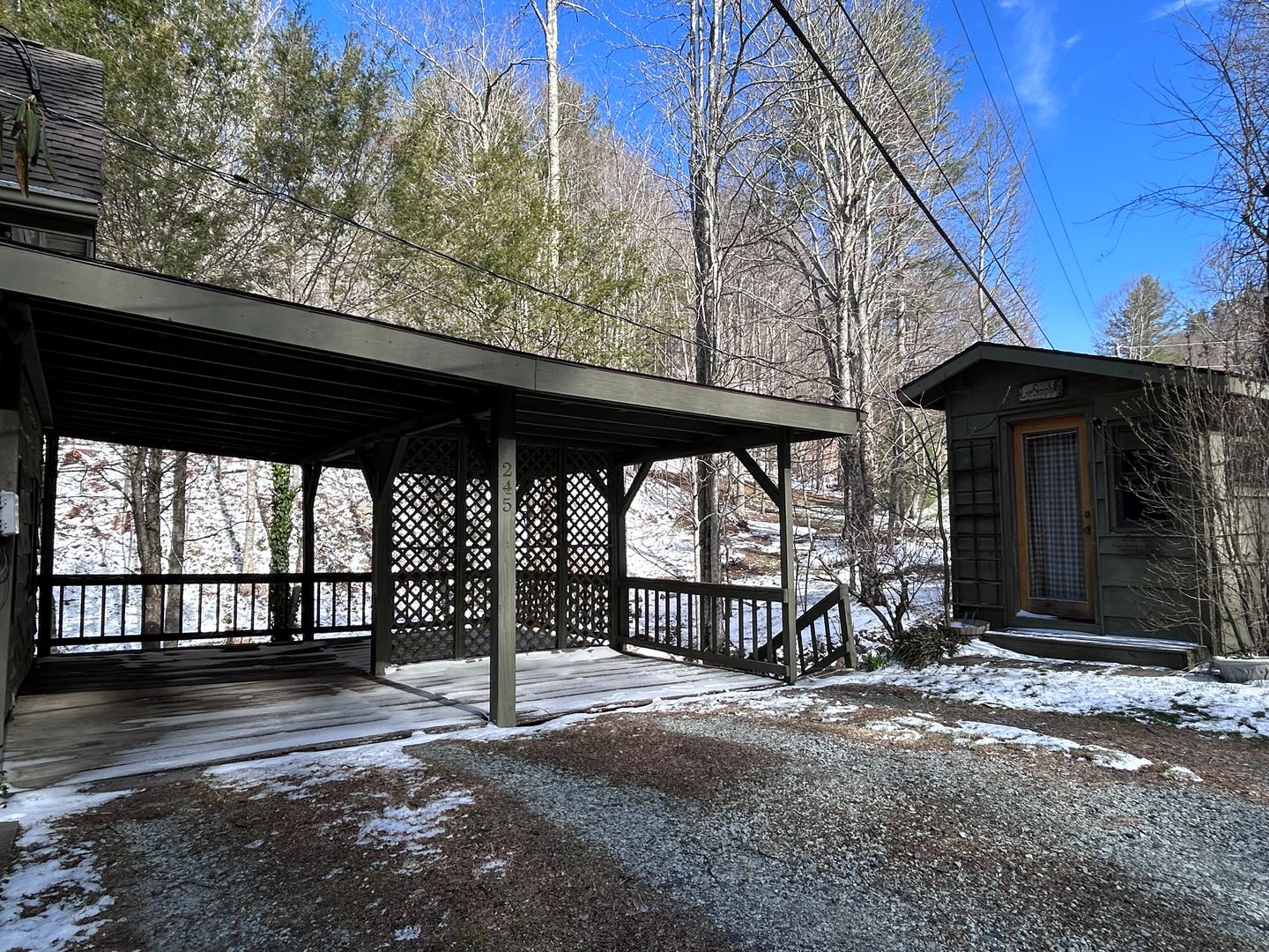 Step outside to an expansive deck overlooking a beautiful creek—an ideal setting to enjoy the surrounding natural scenery and outdoor living. Other features include a covered patio/carport, ample parking, and a detached outbuilding with electricity that works well as a studio, office, reading room, or hobby space. This property offers level access and usable yard space for outdoor enjoyment.