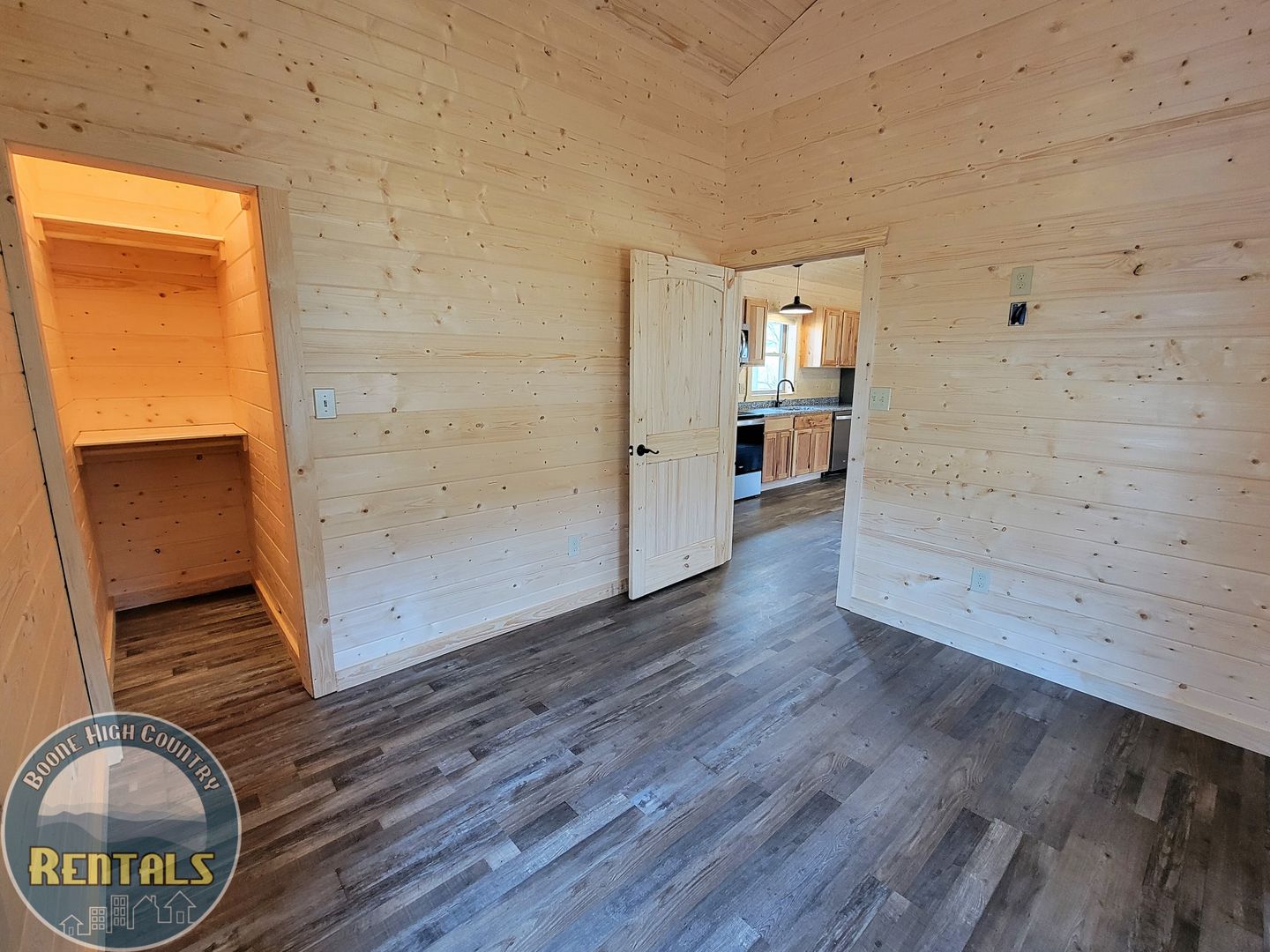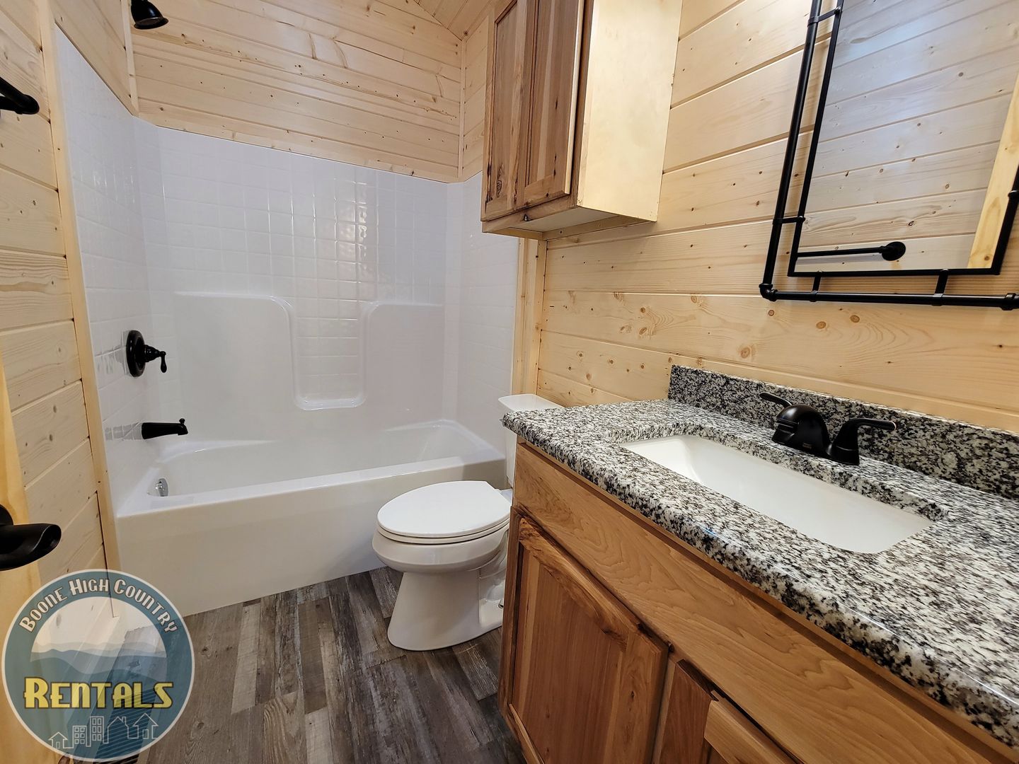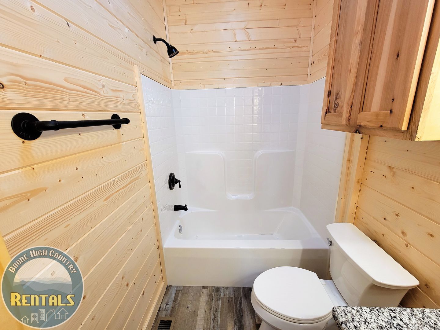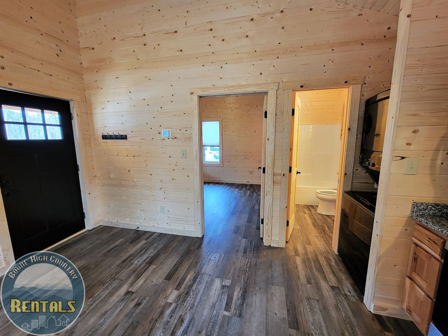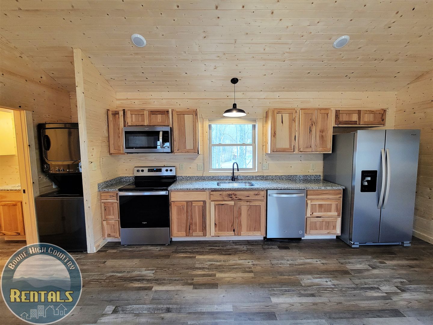 A keyless front door entry leads into an open-concept living room and kitchen. The cabin has luxury vinyl plank flooring throughout, high-vaulted ceilings, and ample natural light. The kitchen features plenty of cabinet space with granite countertops, and includes a refrigerator, dishwasher, electric range, and microwave. There is a stackable washer and dryer tucked away beside the bathroom, which contains a granite countertop and tub/shower combination. The bedroom has the same high ceilings, a fan, and two windows allowing lots of light.