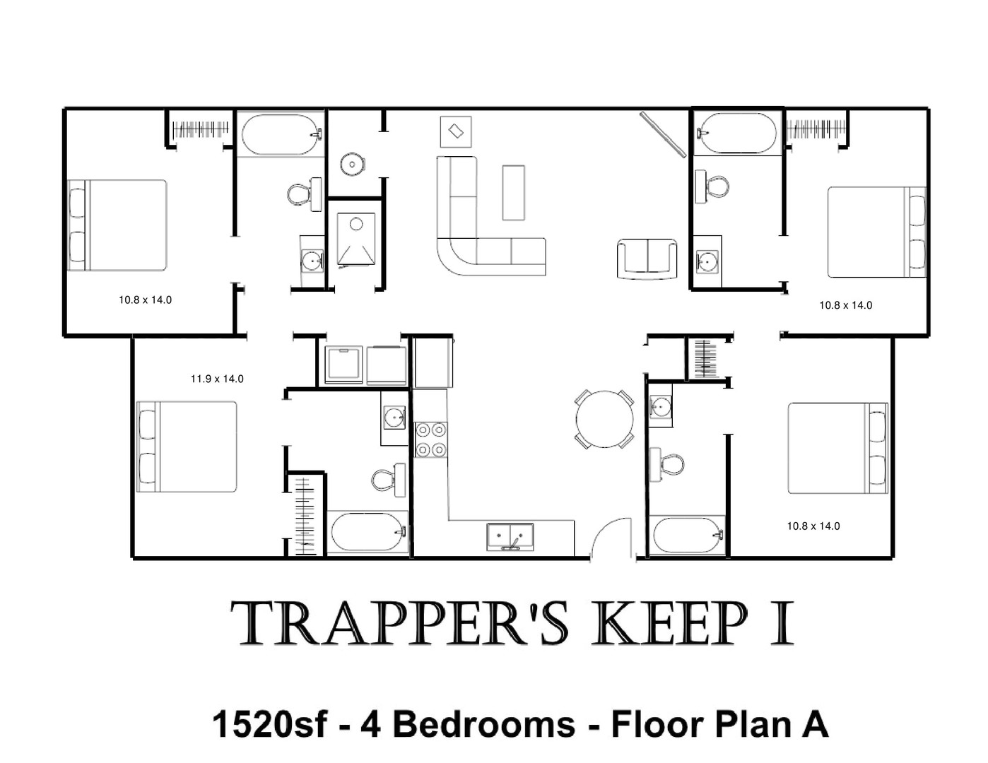 Trapper’s Keep 1 rents between $900-$910 per bedroom, and are on individual leases. The security deposit is typically the same as the rent, with a $75 administrative fee per tenant. The rental price includes standard wi-fi, on-site trash dumpster, and a monthly utility allowance of $60 for water and electricity.